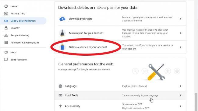 - به پایین رفته و Download, delete, or make a plan for your data را پیدا کرده و گزینه Delete a service or your account را انتخاب کنید.